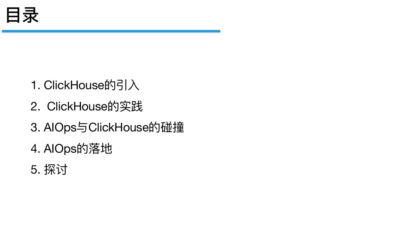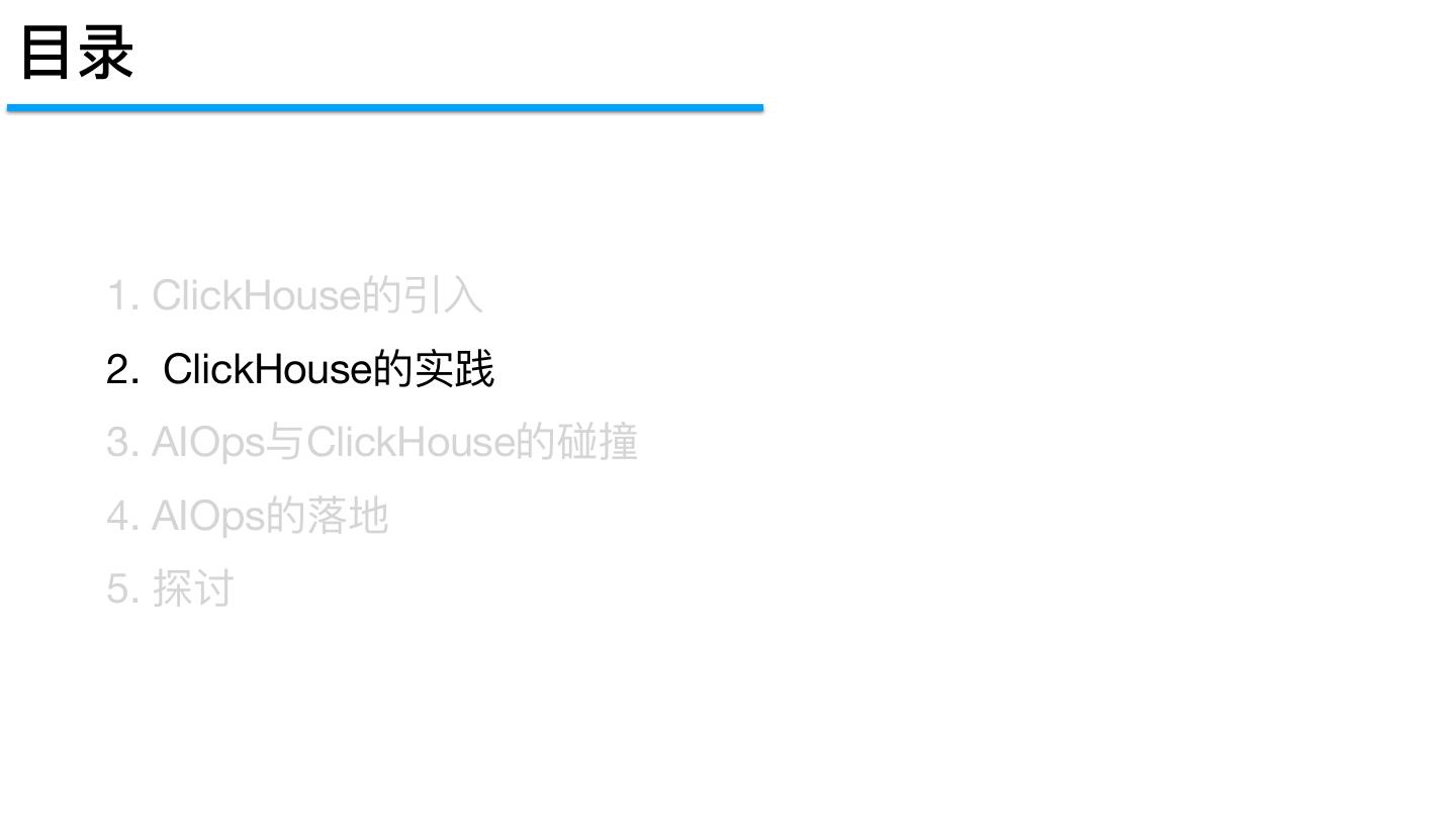 2 .⽬录 1. ClickHouse的引⼊ 2. ClickHouse的实践 3. AIOps与ClickHouse的碰撞 4. AIOps的落地 5. 探讨