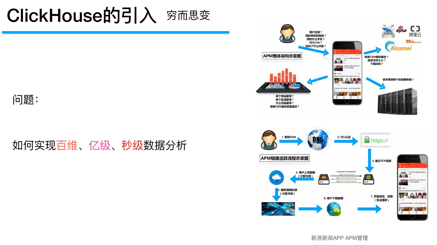 5 .ClickHouse的引⼊ 穷⽽思变 问题: 如何实现百维、亿级、秒级数据分析 新浪新闻APP APM管理