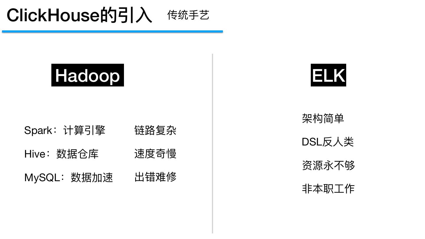 7 .ClickHouse的引⼊ 传统⼿艺 Hadoop ELK ⼈⼒成本⾼ 机器成本⾼ 技术难度⼤ 速度还慢