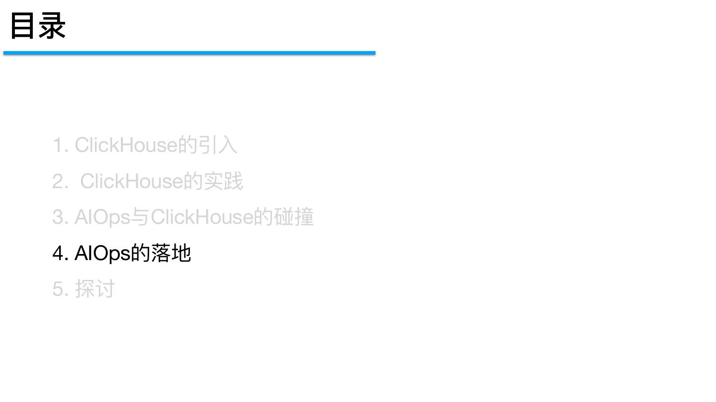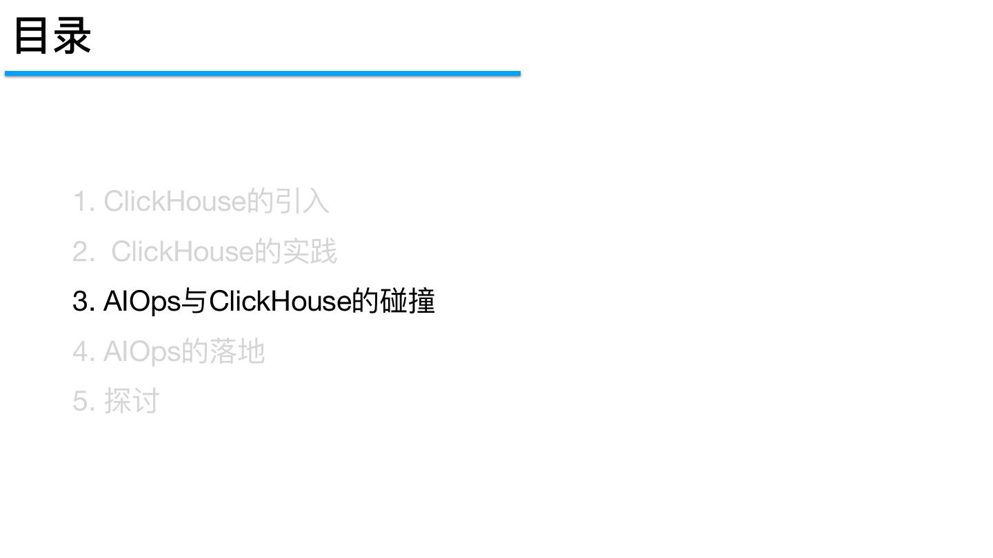 3 .⽬录 1. ClickHouse的引⼊ 2. ClickHouse的实践 3. AIOps与ClickHouse的碰撞 4. AIOps的落地 5. 探讨