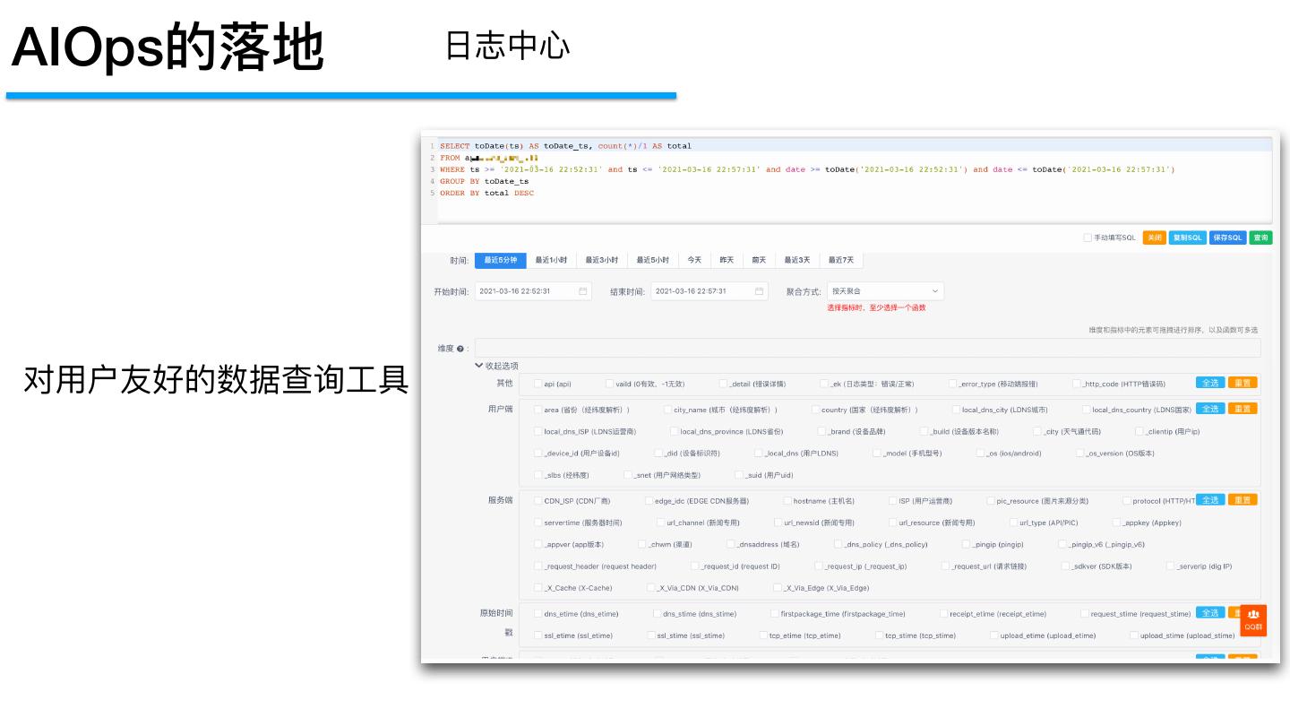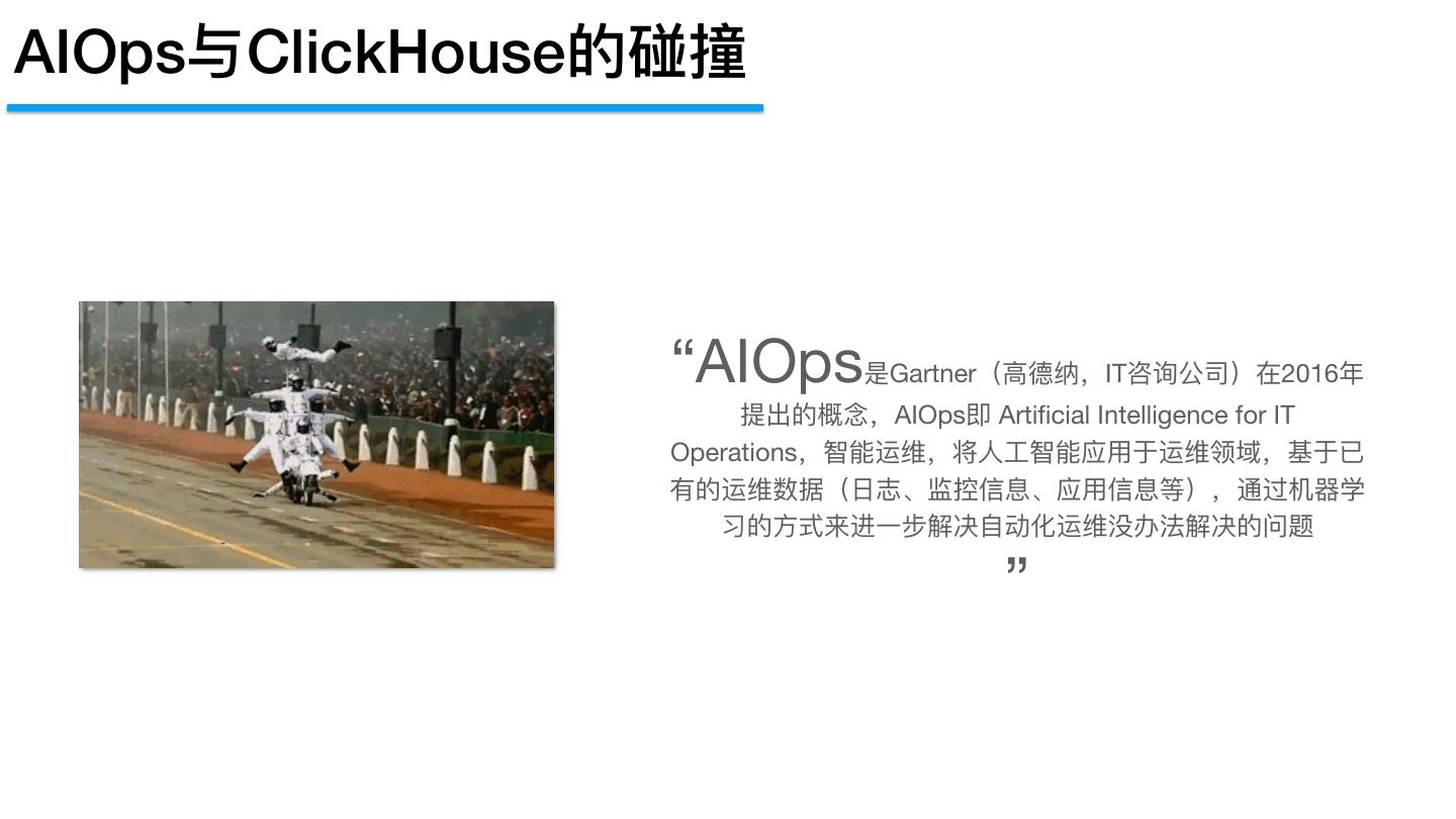 20 .AIOps与ClickHouse的碰撞 “AIOps是Gartner(⾼德纳,IT咨询公司)在2016年 提出的概念,AIOps即 Arti cial Intelligence for IT Operations,智能运维,将⼈⼯智能应⽤于运维领域,基于已 有的运维数据(⽇志、监控信息、应⽤信息等),通过机器学 习的⽅式来进⼀步解决⾃动化运维没办法解决的问题 ” fi