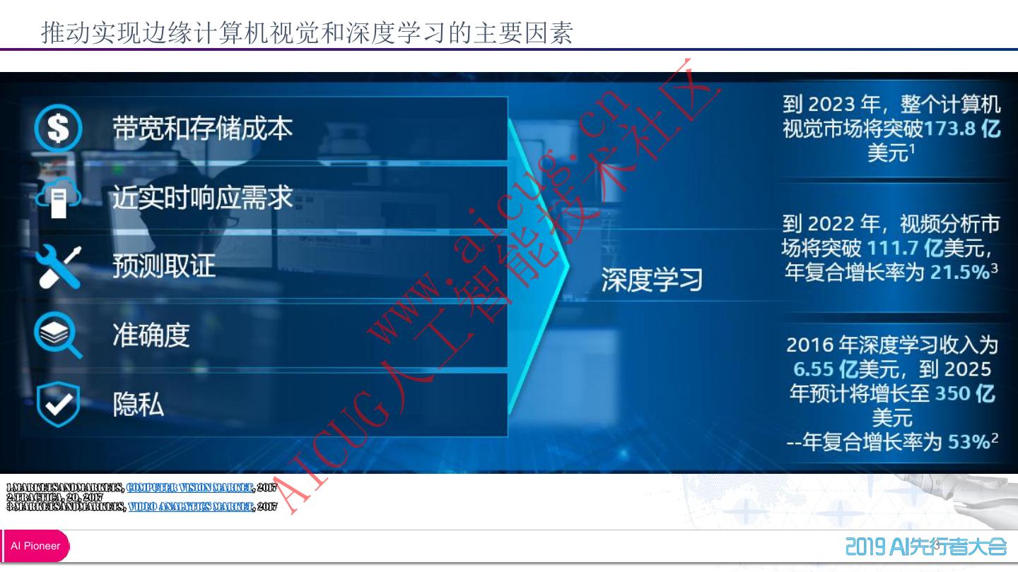 4 . 推动实现边缘计算机视觉和深度学习的主要因素 区 术 cn 社 技 g. 能 cu 智 ai 工 . ww G人 w CU AI 1.Marketsandmarkets, Computer Vision Market, 2017 2.Tractica, 2Q, 2017 3.Marketsandmarkets, Video Analytics Market, 2017 AI Pioneer 3