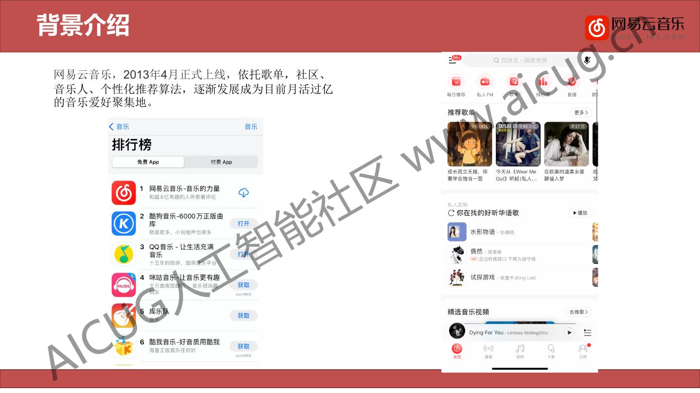 3 .背景介绍 . cn u g ic 网易云音乐,2013年4月正式上线,依托歌单,社区、 . a 音乐人、个性化推荐算法,逐渐发展成为目前月活过亿 w 的音乐爱好聚集地。 w w 社 区 智 能 人 工 U G A IC