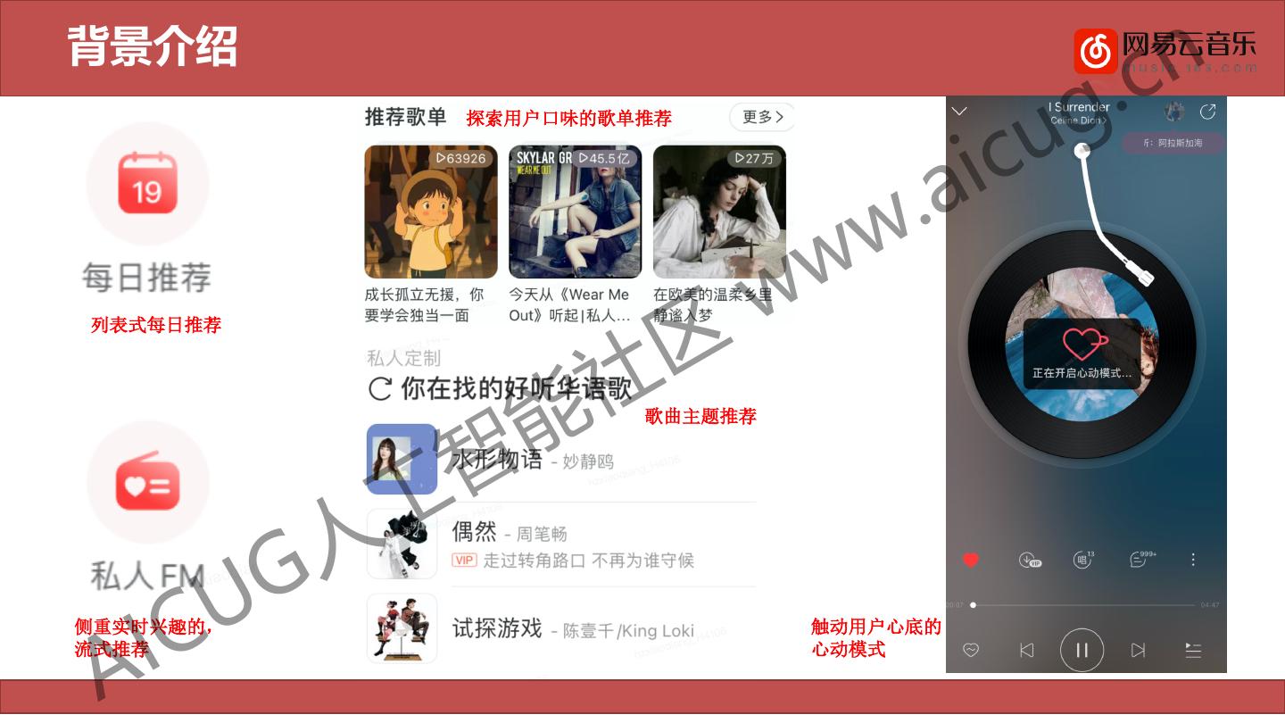 4 .背景介绍 . cn u g ic 探索用户口味的歌单推荐 . a ww w 区 列表式每日推荐 能 社 歌曲主题推荐 工 智 G人 IC U 侧重实时兴趣的, 触动用户心底的 A 流式推荐 心动模式