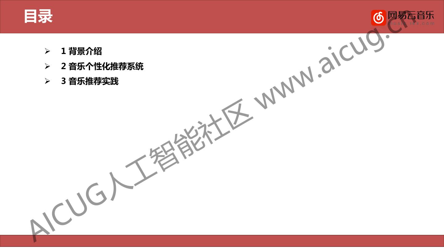 2 .目录 . cn u g Ø 1 背景介绍 . aic w Ø 2 音乐个性化推荐系统 w Ø 3 音乐推荐实践 w 社 区 智 能 人 工 U G A IC