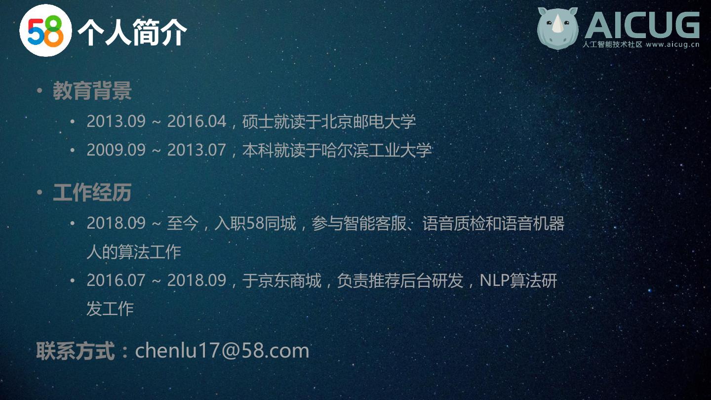 2 .【第2讲】AI技术如何打造智能 语音质检系统 分享嘉宾:陈璐-58同城AI Lab算法高级工程师