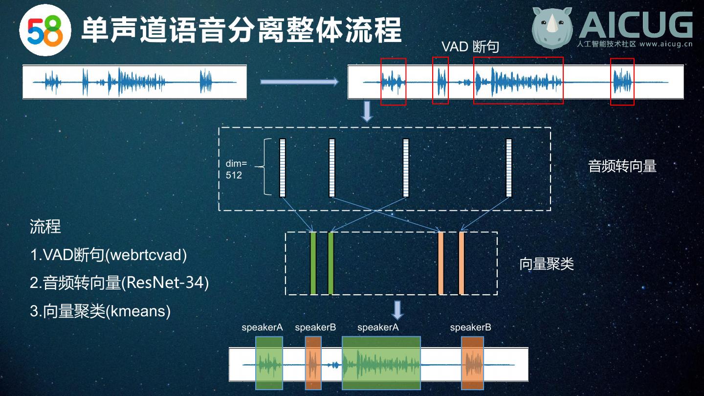 10 . 单声道语音分离整体流程 VAD 断句 dim= 音频转向量 512 流程 1.VAD断句(webrtcvad) 向量聚类 2.音频转向量(ResNet-34) 3.向量聚类(kmeans) speakerA speakerB speakerA speakerB