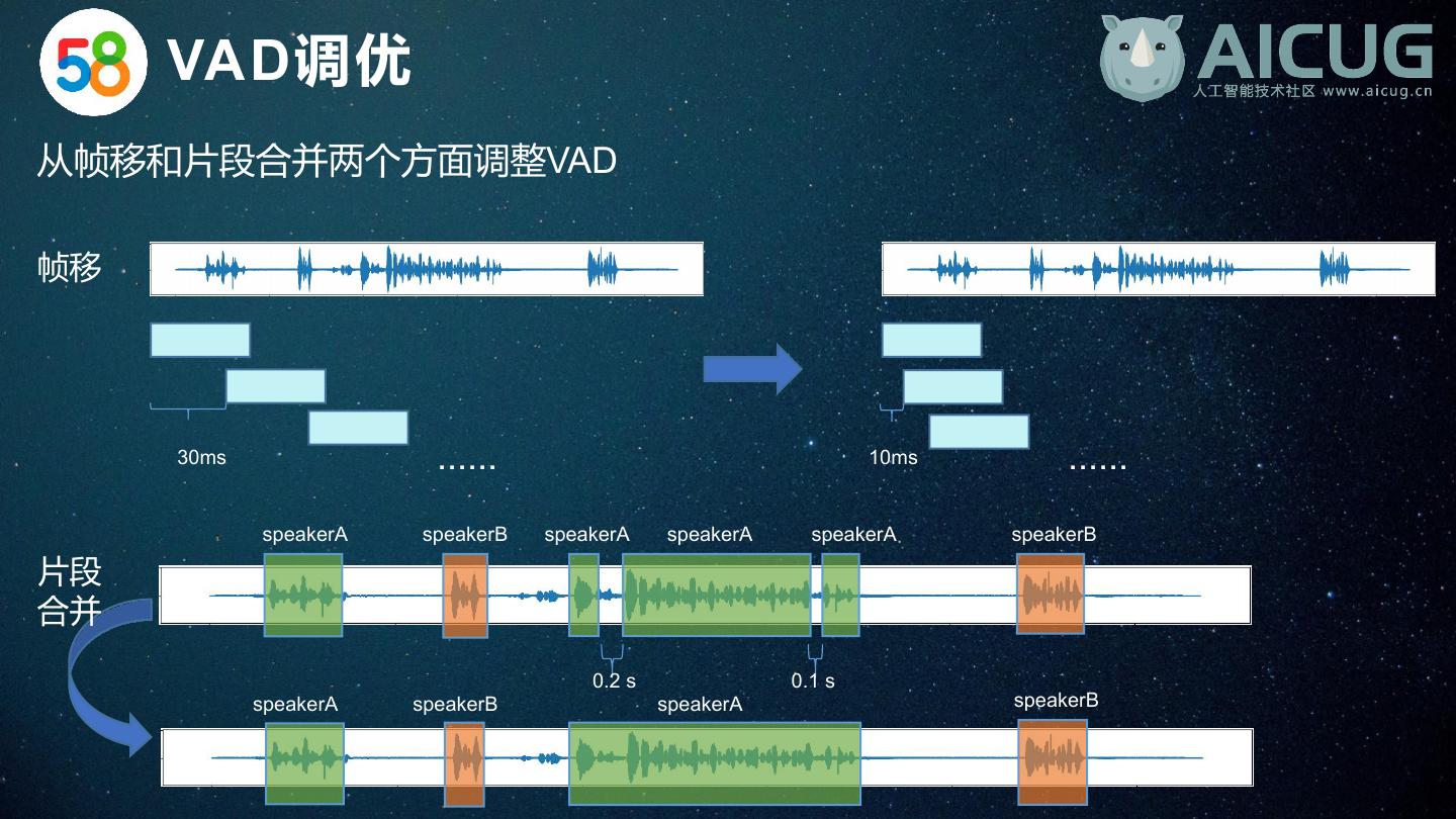 11 . VAD调优 从帧移和片段合并两个方面调整VAD 帧移 30ms ...... 10ms ...... speakerA speakerB speakerA speakerA speakerA speakerB 片段 合并 0.2 s 0.1 s speakerA speakerB speakerA speakerB
