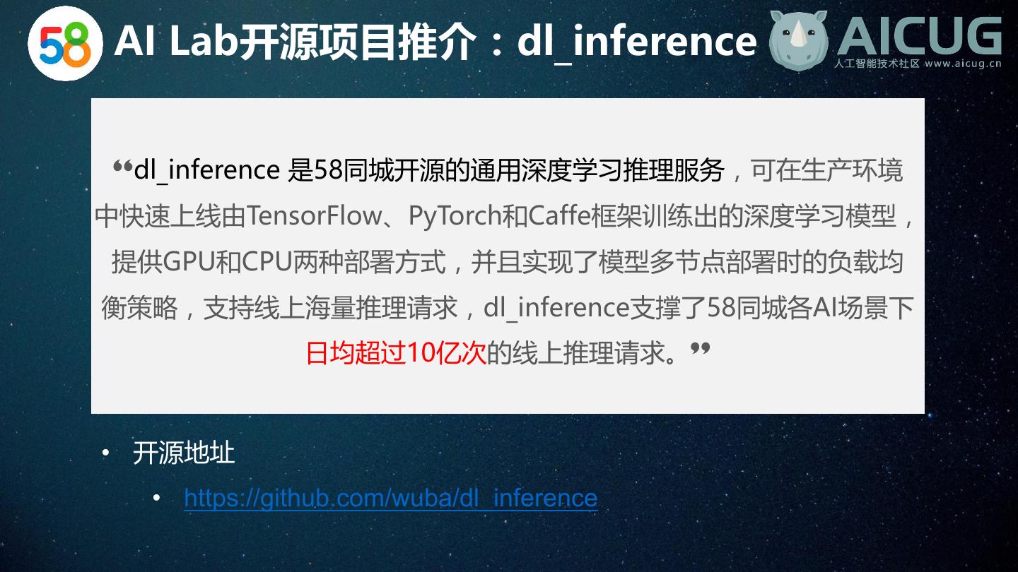 29 . AI Lab开源项目推介:dl_inference “dl_inference 是58同城开源的通用深度学习推理服务,可在生产环境 中快速上线由TensorFlow、PyTorch和Caffe框架训练出的深度学习模型, 提供GPU和CPU两种部署方式,并且实现了模型多节点部署时的负载均 衡策略,支持线上海量推理请求,dl_inference支撑了58同城各AI场景下 日均超过10亿次的线上推理请求。” • 开源地址 • https://github.com/wuba/dl_inference