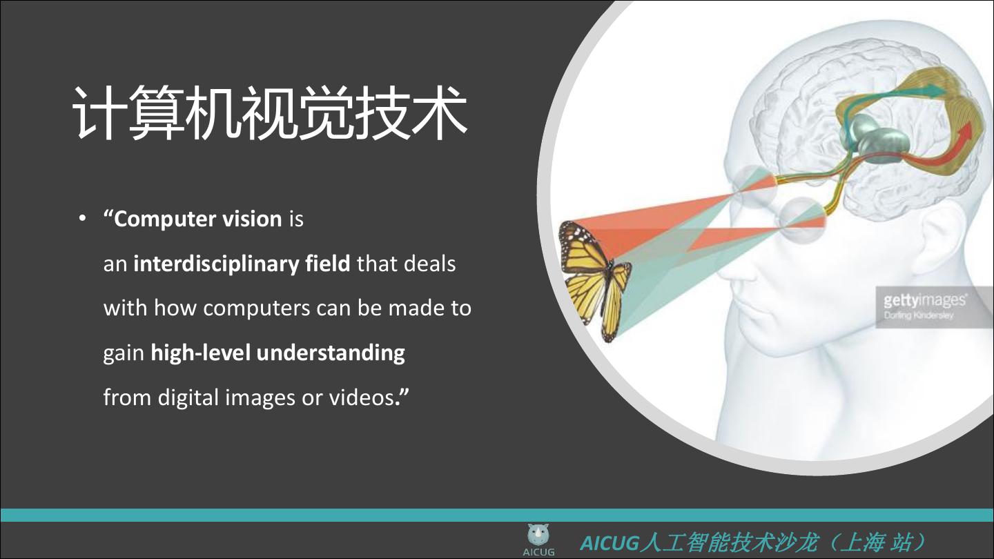 6 .计算机视觉技术 • “Computer vision is an interdisciplinary field that deals with how computers can be made to gain high-level understanding from digital images or videos.” AICUG人工智能技术沙龙(上海 站)