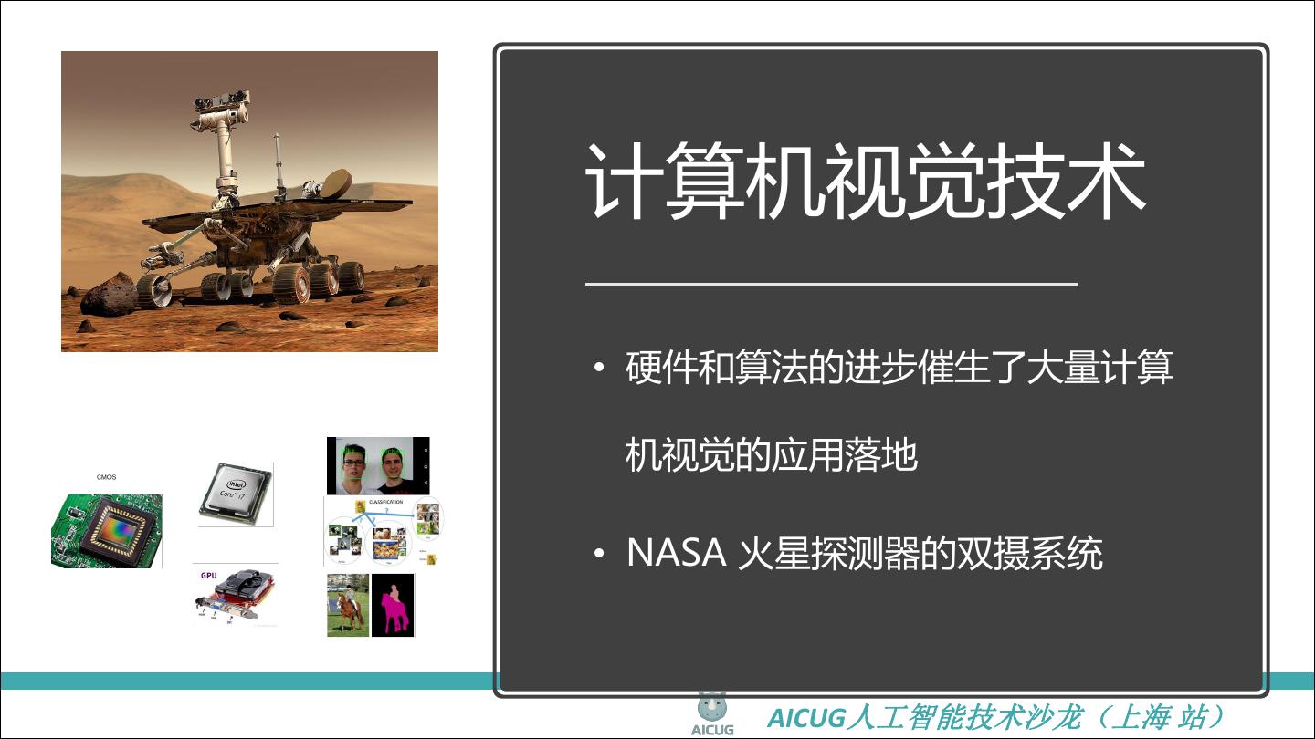 7 .计算机视觉技术 • 硬件和算法的进步催生了大量计算 机视觉的应用落地 • NASA 火星探测器的双摄系统 AICUG人工智能技术沙龙(上海 站)