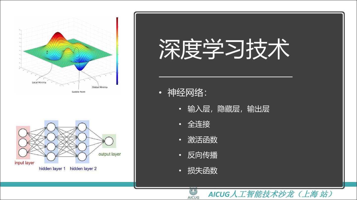 9 .深度学习技术 • 神经网络: • 输入层,隐藏层,输出层 • 全连接 • 激活函数 • 反向传播 • 损失函数 AICUG人工智能技术沙龙(上海 站)
