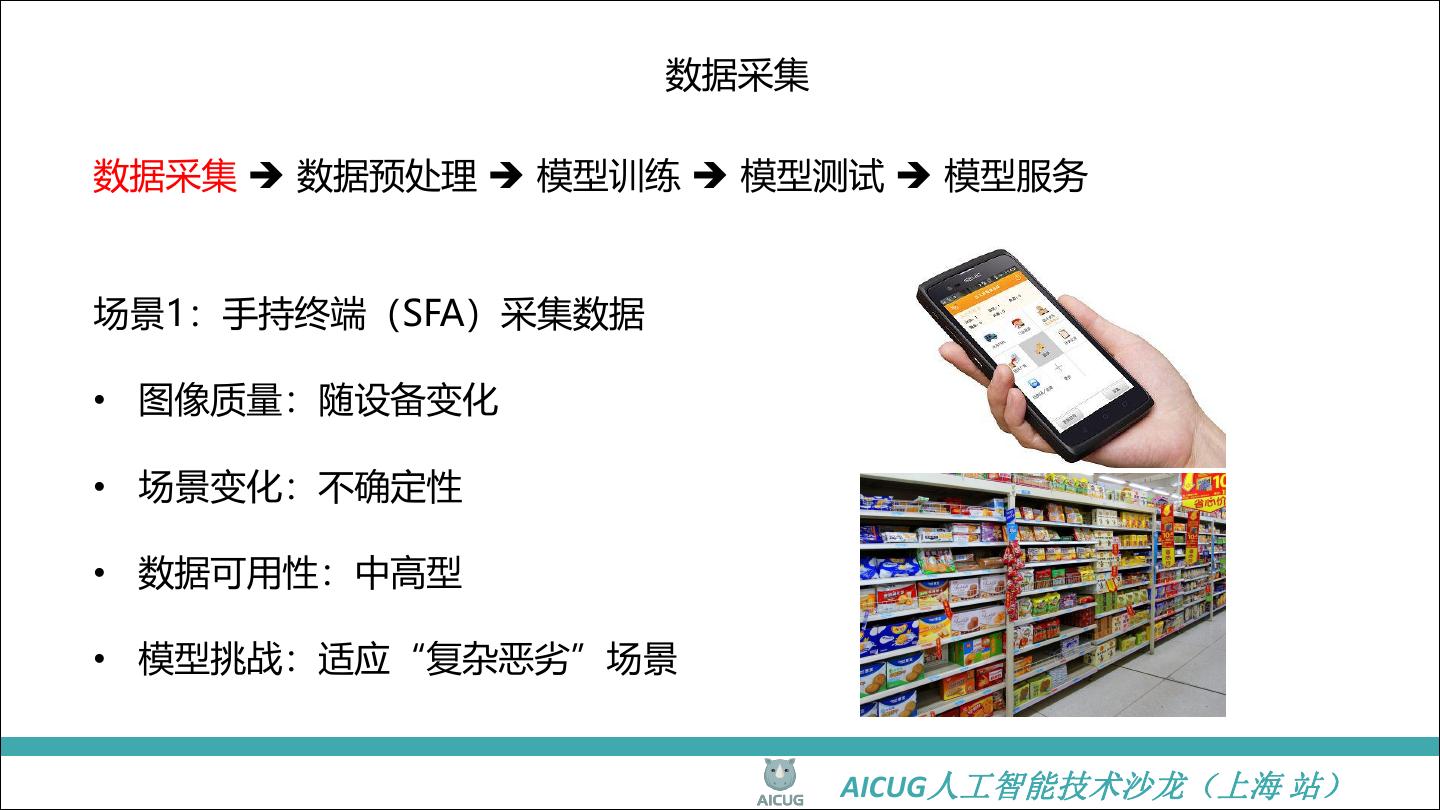 12 . 数据采集 数据采集 数据预处理 模型训练 模型测试 模型服务 场景1:手持终端(SFA)采集数据 • 图像质量:随设备变化 • 场景变化:不确定性 • 数据可用性:中高型 • 模型挑战:适应“复杂恶劣”场景 AICUG人工智能技术沙龙(上海 站)