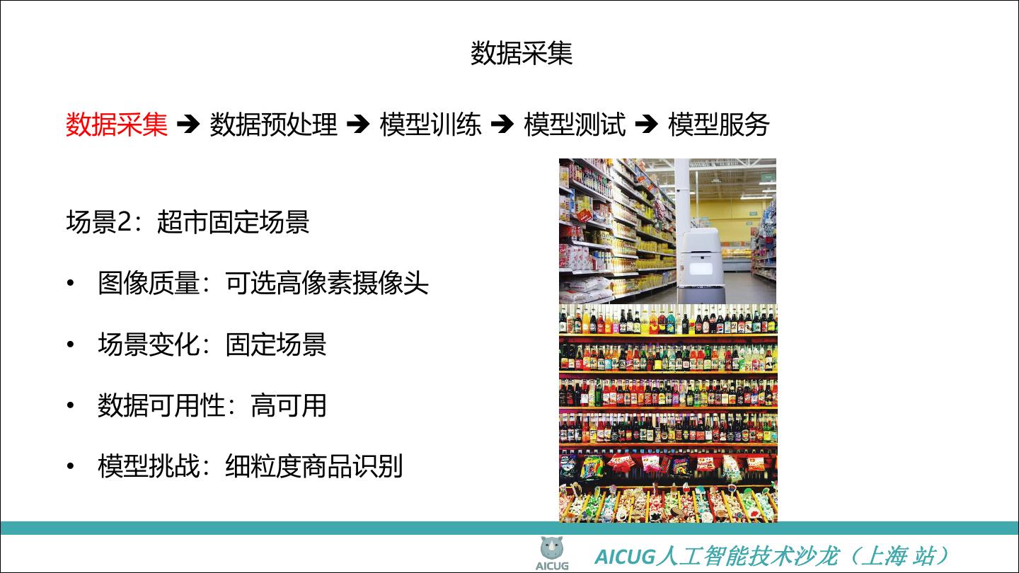 13 . 数据采集 数据采集 数据预处理 模型训练 模型测试 模型服务 场景2:超市固定场景 • 图像质量:可选高像素摄像头 • 场景变化:固定场景 • 数据可用性:高可用 • 模型挑战:细粒度商品识别 AICUG人工智能技术沙龙(上海 站)
