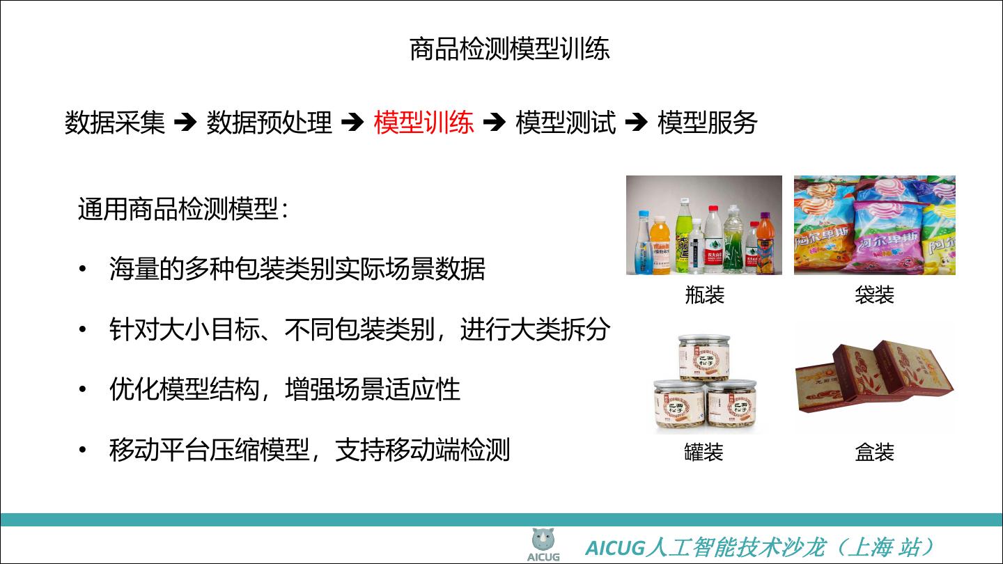 17 . 商品检测模型训练 数据采集 数据预处理 模型训练 模型测试 模型服务 通用商品检测模型: • 海量的多种包装类别实际场景数据 瓶装 袋装 • 针对大小目标、不同包装类别,进行大类拆分 • 优化模型结构,增强场景适应性 • 移动平台压缩模型,支持移动端检测 罐装 盒装 AICUG人工智能技术沙龙(上海 站)