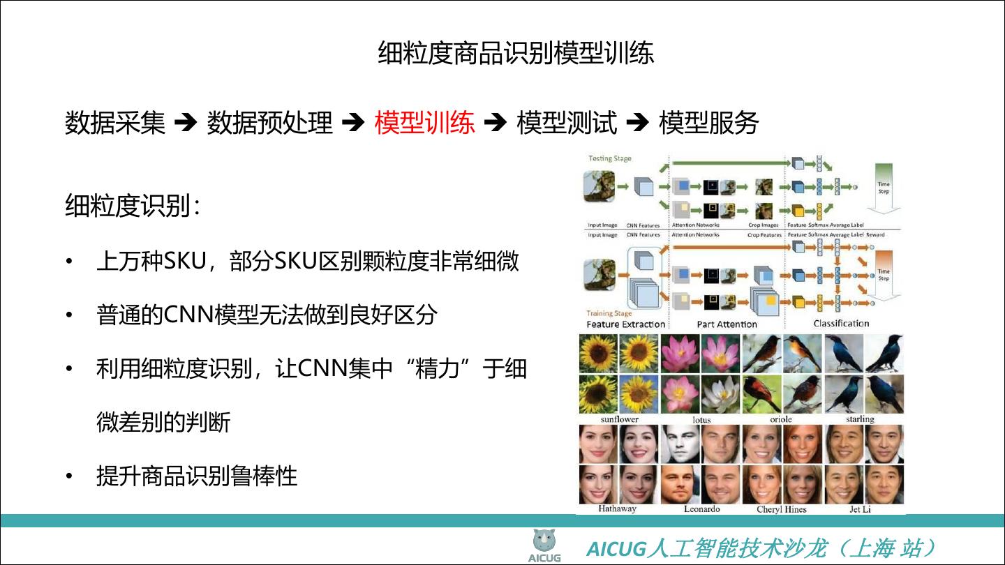 18 . 细粒度商品识别模型训练 数据采集 数据预处理 模型训练 模型测试 模型服务 细粒度识别: • 上万种SKU,部分SKU区别颗粒度非常细微 • 普通的CNN模型无法做到良好区分 • 利用细粒度识别,让CNN集中“精力”于细 微差别的判断 • 提升商品识别鲁棒性 AICUG人工智能技术沙龙(上海 站)