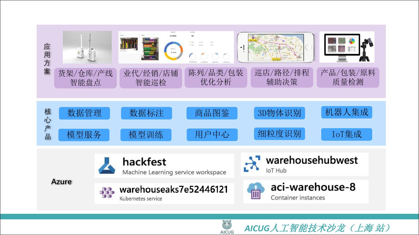 26 .应 用 方 案 货架/仓库/产线 业代/经销/店铺 陈列/品类/包装 巡店/路径/排程 产品/包装/原料 智能盘点 智能巡检 优化分析 辅助决策 质量检测 核 数据管理 数据标注 商品图鉴 3D物体识别 机器人集成 心 产 品 模型服务 模型训练 用户中心 细粒度识别 IoT集成 Azure AICUG人工智能技术沙龙(上海 站)