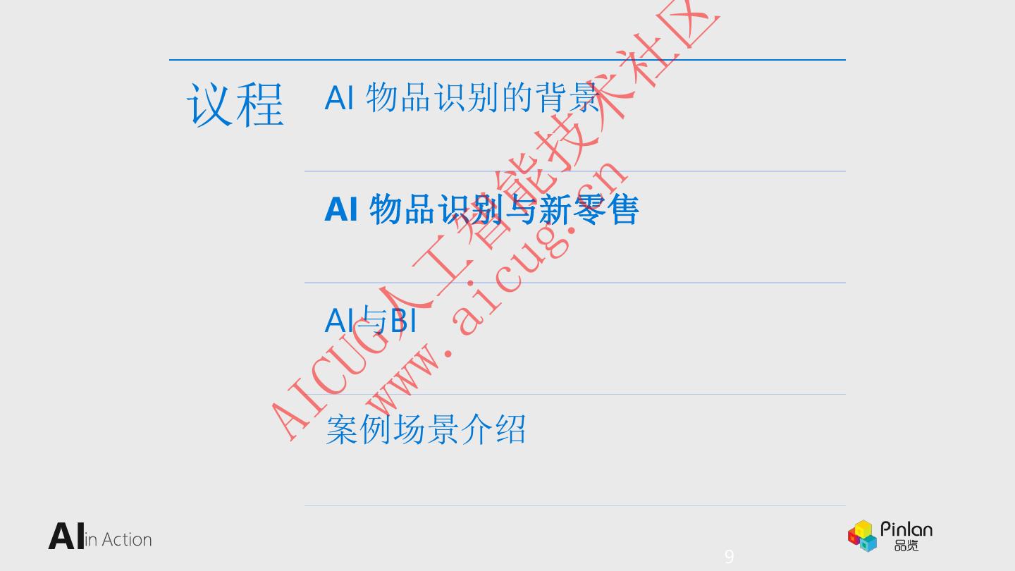 9 . 区 Cloud 云计算的三大要素 社 议程 AI 物品识别的背景 cn 术 g. 技 cu 能 AI 物品识别与新零售 ai 智 w. 工 AI与BI ww G人 CU AI 案例场景介绍 AI 9