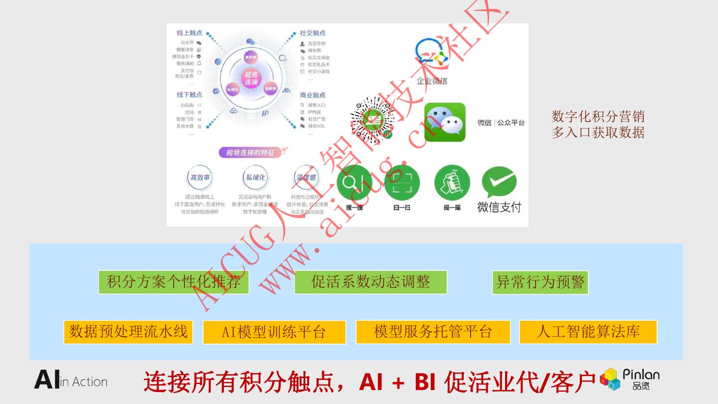 24 . 区 社 cn 术 g. 技 数字化积分营销 cu 能 多入口获取数据 ai 智 w. 工 ww G人 CU 积分方案个性化推荐 促活系数动态调整 异常行为预警 AI 数据预处理流水线 AI模型训练平台 模型服务托管平台 人工智能算法库 AI 连接所有积分触点,AI + BI 促活业代/客户