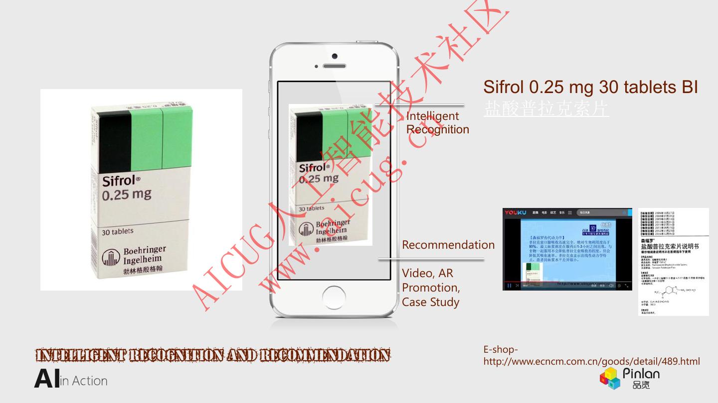 28 . 区 社 cn 术 Sifrol 0.25 mg 30 tablets BI g. 技 Intelligent 盐酸普拉克索片 Recognition cu 能 ai 智 w. 工 ww G人 Recommendation CU Video, AR Promotion, AI Case Study E-shop- Intelligent Recognition and Recommendation http://www.ecncm.com.cn/goods/detail/489.html AI