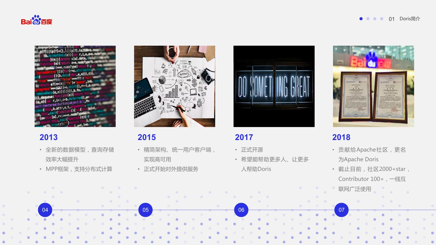 5 . 01 Doris简介 发展历程 2008 2009 2012 • 1.0版本正式上线 • 进行了通用化改造,开始承 • 随百度业务飞速发展,对 • 应用于百度凤巢统计报表的 接公司内部其他报表系统 Doris的性能、可用性、拓 需求场景,上线后数据更新 • 助力百度统计成为国内最大 展性进行了全面升级 频率从天级提升至分钟级 的中文网站分析工具 • 承担百度所有统计报表业务 01 02 03