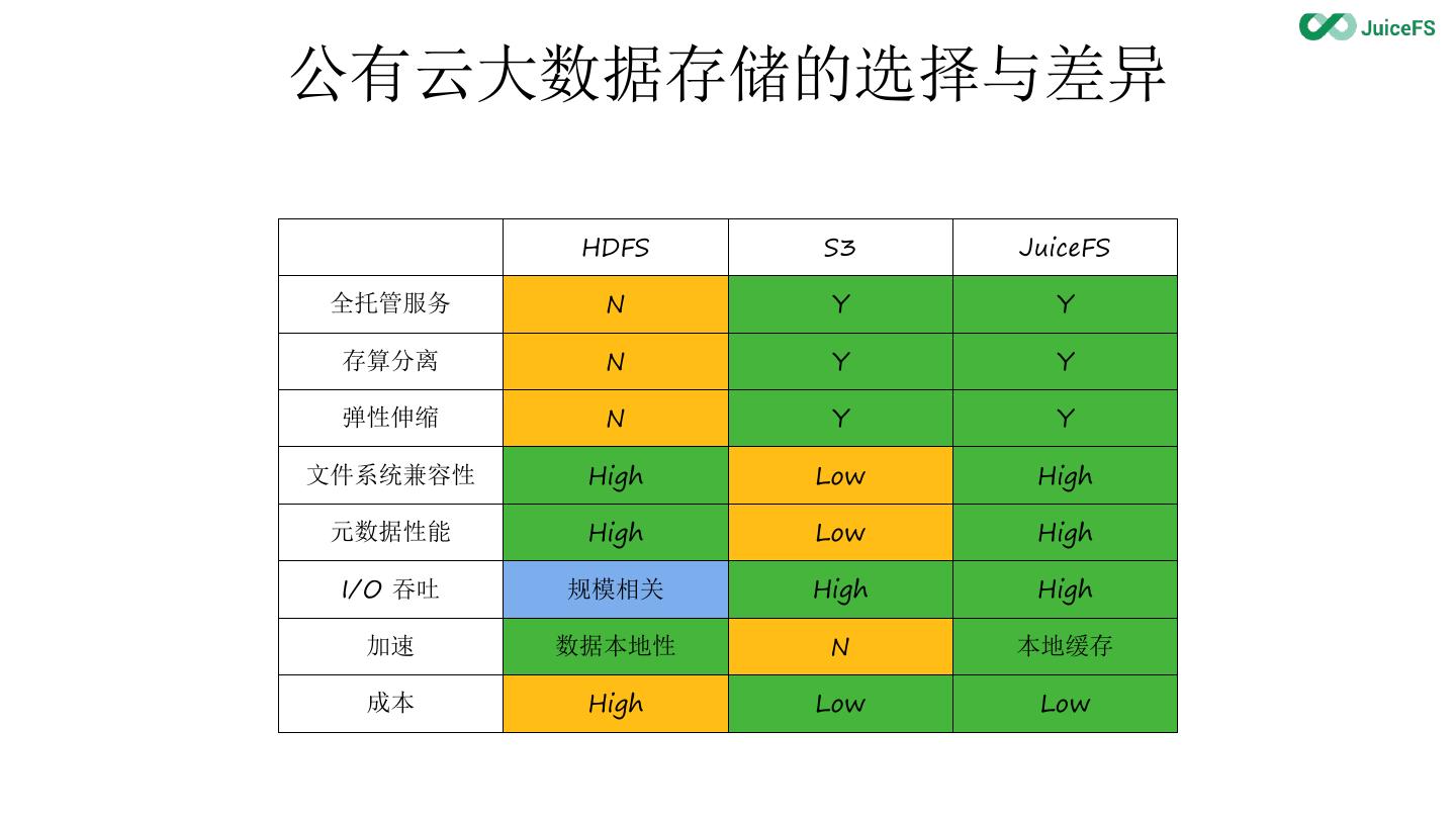 4 .公有云大数据存储的选择与差异 HDFS S3 JuiceFS 全托管服务 N Y Y 存算分离 N Y Y 弹性伸缩 N Y Y 文件系统兼容性 High Low High 元数据性能 High Low High I/O 吞吐 规模相关 High High 加速 数据本地性 N 本地缓存 成本 High Low Low