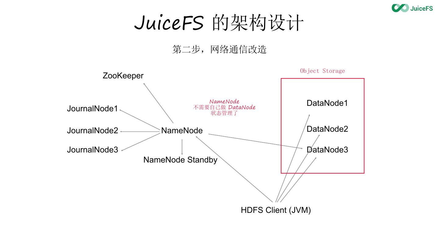 9 . JuiceFS 的架构设计 第二步,网络通信改造 Object Storage ZooKeeper NameNode DataNode1 JournalNode1 不需要自己做 DataNode 状态管理了 JournalNode2 NameNode DataNode2 JournalNode3 DataNode3 NameNode Standby HDFS Client (JVM)