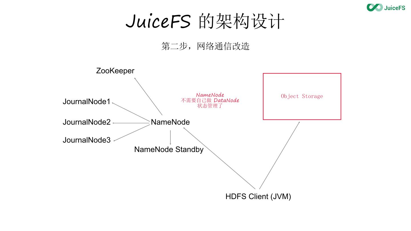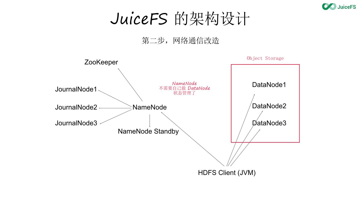 12 . JuiceFS 的架构设计 第二步,网络通信改造 ZooKeeper NameNode Object Storage JournalNode1 不需要自己做 DataNode 状态管理了 JournalNode2 NameNode JournalNode3 NameNode Standby HDFS Client (JVM)