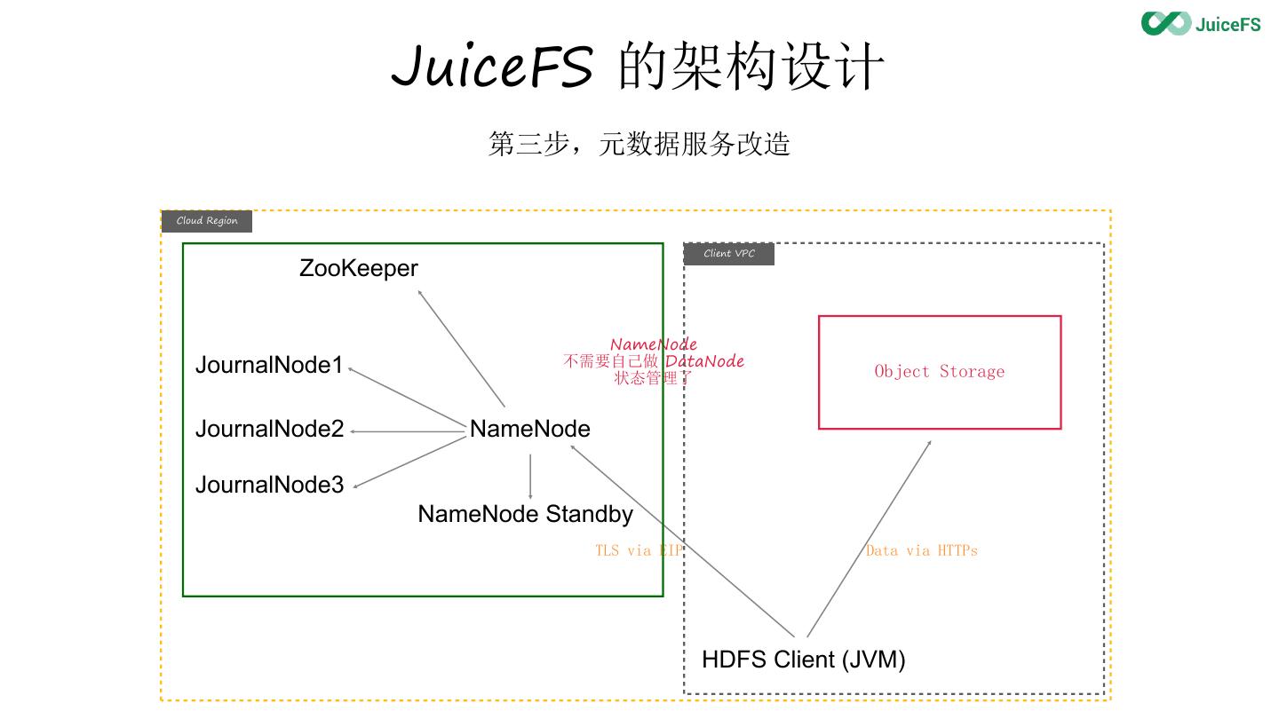 14 . JuiceFS 的架构设计 第三步,元数据服务改造 Cloud Region Client VPC ZooKeeper NameNode JournalNode1 不需要自己做 DataNode 状态管理了 Object Storage JournalNode2 NameNode JournalNode3 NameNode Standby TLS via EIP Data via HTTPs HDFS Client (JVM)