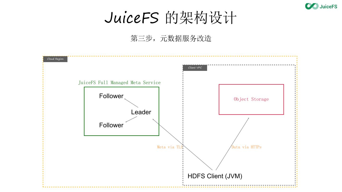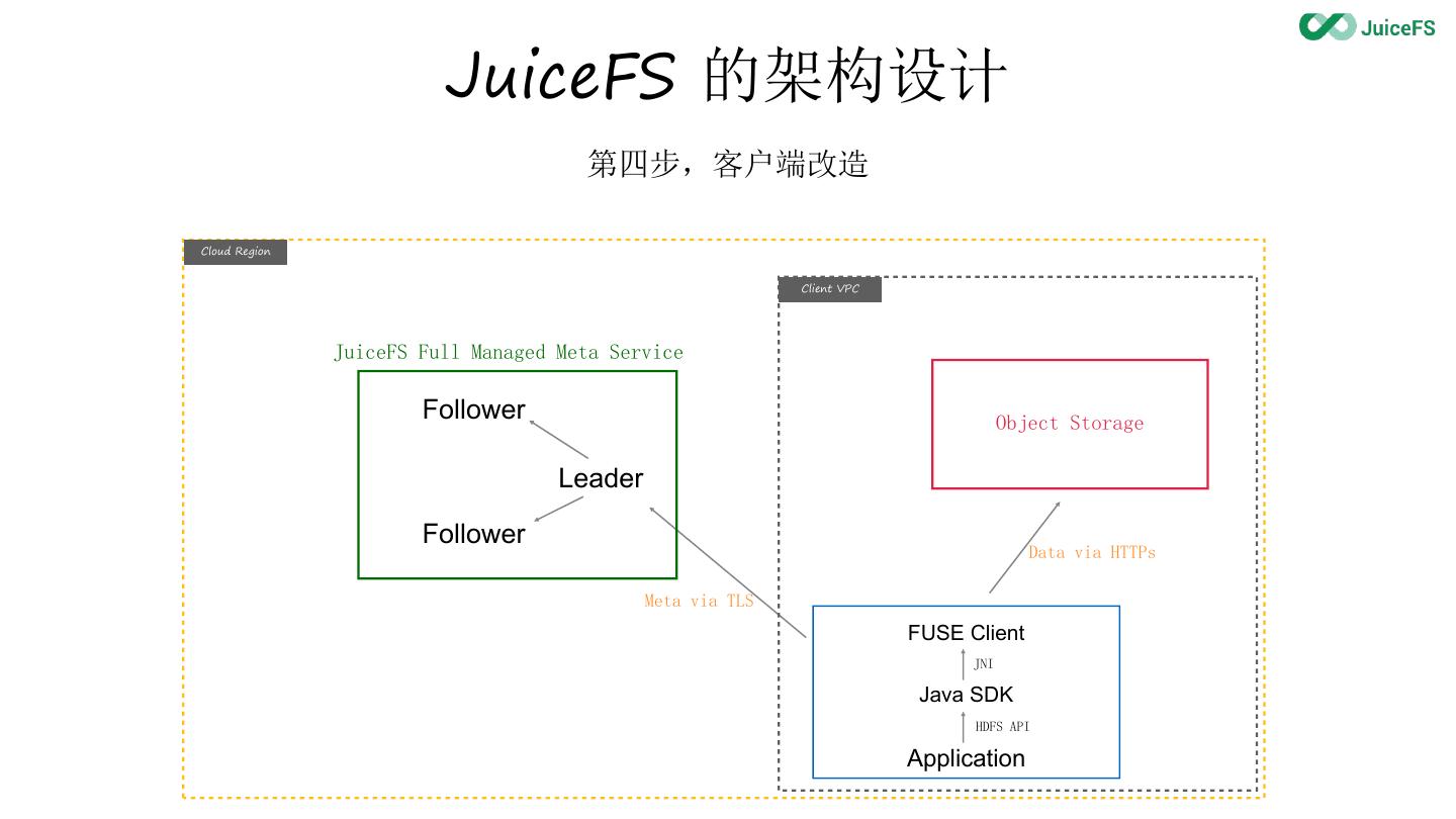 16 . JuiceFS 的架构设计 第四步,客户端改造 Cloud Region Client VPC JuiceFS Full Managed Meta Service Follower Object Storage Leader Follower Data via HTTPs Meta via TLS FUSE Client JNI Java SDK HDFS API Application