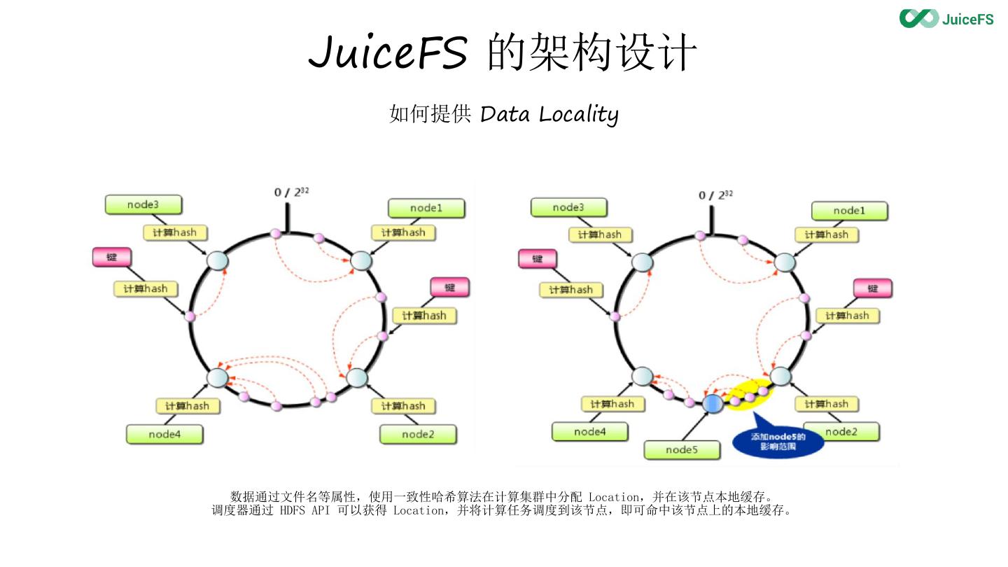 21 . JuiceFS 的架构设计 如何提供 Data Locality 数据通过文件名等属性,使用一致性哈希算法在计算集群中分配 Location,并在该节点本地缓存。 调度器通过 HDFS API 可以获得 Location,并将计算任务调度到该节点,即可命中该节点上的本地缓存。