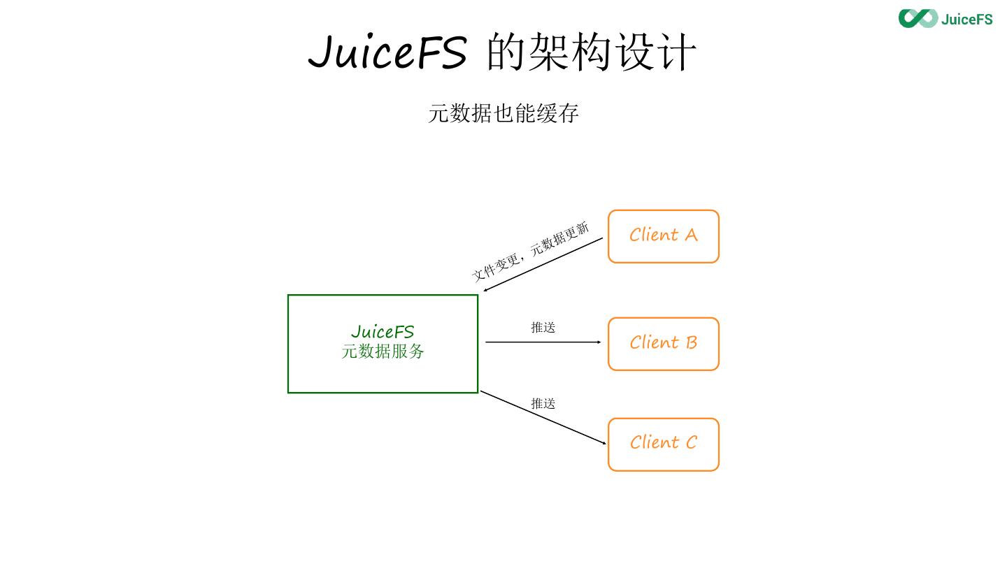 22 .JuiceFS 的架构设计 元数据也能缓存 据 更 新 Client A 元 数 变更, 文 件 JuiceFS 推送 Client B 元数据服务 推送 Client C