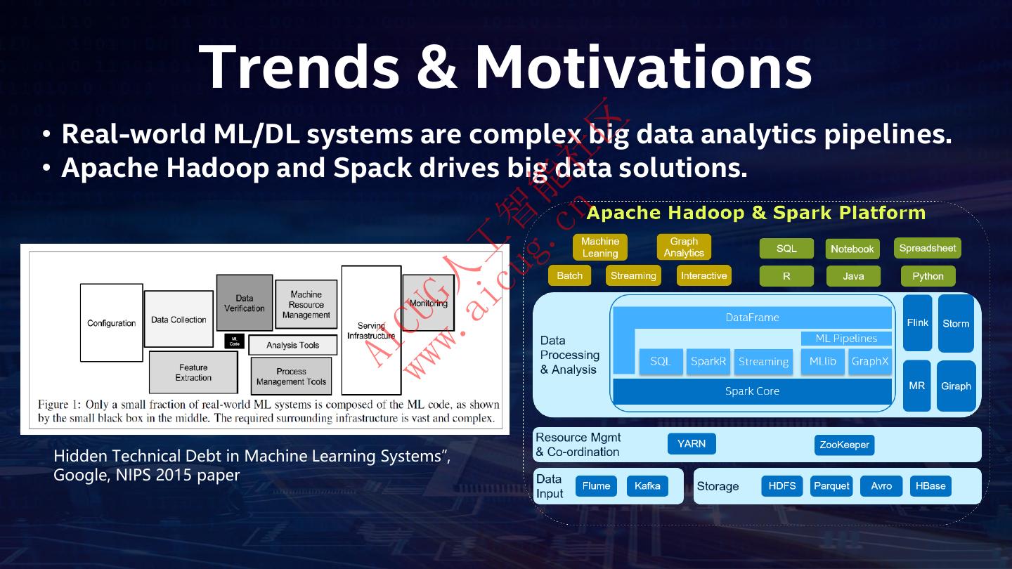 4 . Trends & Motivations • Real-world ML/DL systems are complex big data analytics pipelines. 区 cn 社 • Apache Hadoop and Spack drives big data solutions. g. 能 cu 智 ai 工 w. G人 ww CU AI Hidden Technical Debt in Machine Learning Systems”, Google, NIPS 2015 paper