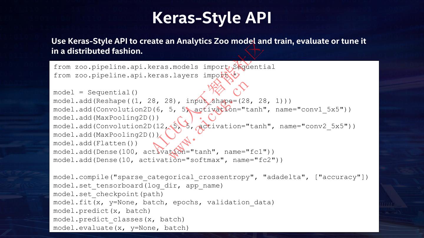 7 . Keras-Style API Use Keras-Style API to create an Analytics Zoo model and train, evaluate or tune it in a distributed fashion. 区 cn 社 from zoo.pipeline.api.keras.models import Sequential from zoo.pipeline.api.keras.layers import * g. 能 cu 智 model = Sequential() model.add(Reshape((1, 28, 28), input_shape=(28, 28, 1))) ai 工 model.add(Convolution2D(6, 5, 5, activation="tanh", name="conv1_5x5")) w. G人 model.add(MaxPooling2D()) model.add(Convolution2D(12, 5, 5, activation="tanh", name="conv2_5x5")) ww CU model.add(MaxPooling2D()) model.add(Flatten()) AI model.add(Dense(100, activation="tanh", name="fc1")) model.add(Dense(10, activation="softmax", name="fc2")) model.compile("sparse_categorical_crossentropy", "adadelta", ["accuracy"]) model.set_tensorboard(log_dir, app_name) model.set_checkpoint(path) model.fit(x, y=None, batch, epochs, validation_data) model.predict(x, batch) model.predict_classes(x, batch) model.evaluate(x, y=None, batch)