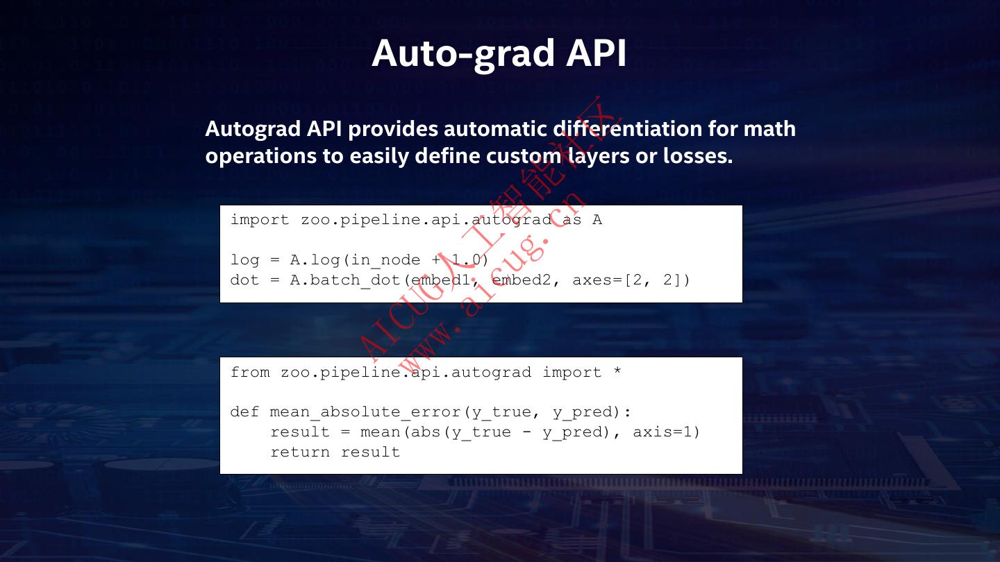 8 . Auto-grad API 区 Autograd API provides automatic differentiation for math operations to easily define custom layers or losses. cn 社 g. 能 cu 智 import zoo.pipeline.api.autograd as A ai 工 log = A.log(in_node + 1.0) w. G人 dot = A.batch_dot(embed1, embed2, axes=[2, 2]) ww CU AI from zoo.pipeline.api.autograd import * def mean_absolute_error(y_true, y_pred): result = mean(abs(y_true - y_pred), axis=1) return result