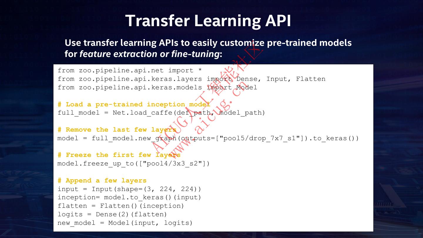 9 . Transfer Learning API Use transfer learning APIs to easily customize pre-trained models for feature extraction or fine-tuning: 区 cn 社 from zoo.pipeline.api.net import * g. 能 from zoo.pipeline.api.keras.layers import Dense, Input, Flatten from zoo.pipeline.api.keras.models import Model cu 智 ai 工 # Load a pre-trained inception model full_model = Net.load_caffe(def_path, model_path) w. G人 # Remove the last few layers ww CU model = full_model.new_graph(outputs=["pool5/drop_7x7_s1"]).to_keras()) AI # Freeze the first few layers model.freeze_up_to(["pool4/3x3_s2"]) # Append a few layers input = Input(shape=(3, 224, 224)) inception= model.to_keras()(input) flatten = Flatten()(inception) logits = Dense(2)(flatten) new_model = Model(input, logits)