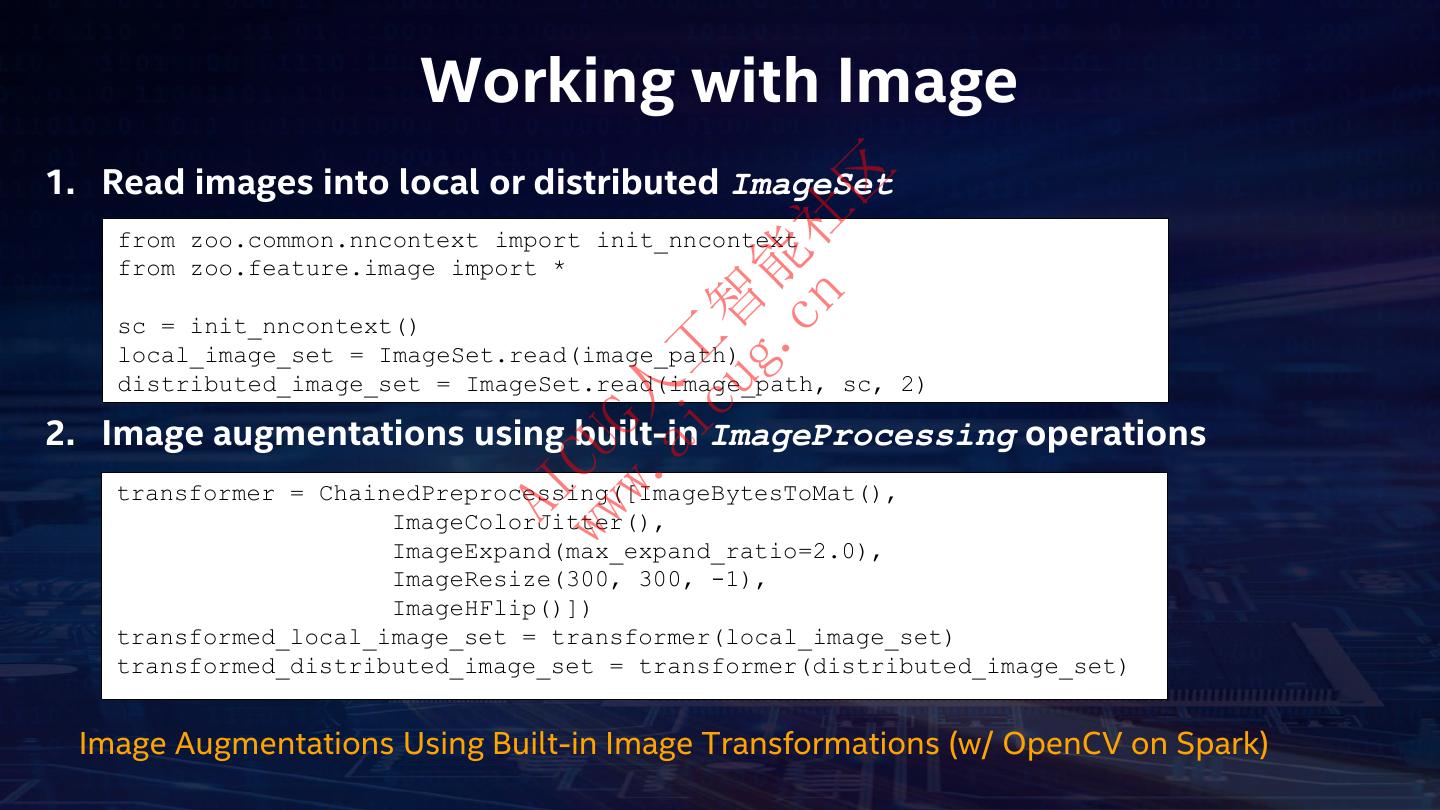 10 . Working with Image 1. Read images into local or distributed ImageSet 区 cn 社 from zoo.common.nncontext import init_nncontext g. 能 from zoo.feature.image import * cu 智 sc = init_nncontext() ai 工 local_image_set = ImageSet.read(image_path) distributed_image_set = ImageSet.read(image_path, sc, 2) w. G人 2. Image augmentations using built-in ImageProcessing operations ww CU transformer = ChainedPreprocessing([ImageBytesToMat(), AI ImageColorJitter(), ImageExpand(max_expand_ratio=2.0), ImageResize(300, 300, -1), ImageHFlip()]) transformed_local_image_set = transformer(local_image_set) transformed_distributed_image_set = transformer(distributed_image_set) Image Augmentations Using Built-in Image Transformations (w/ OpenCV on Spark)