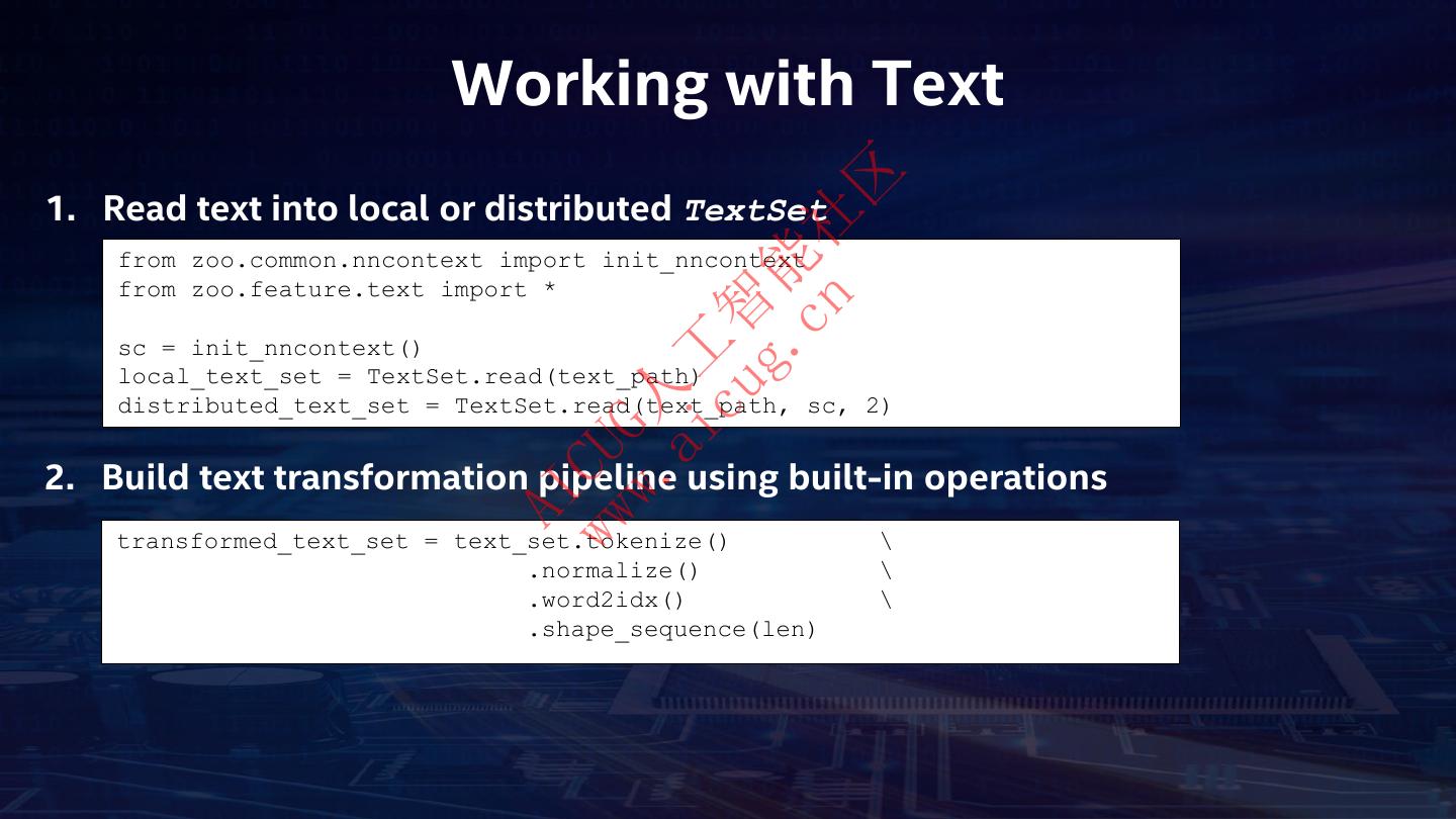 11 . Working with Text 区 1. Read text into local or distributed TextSet cn 社 from zoo.common.nncontext import init_nncontext g. 能 from zoo.feature.text import * cu 智 sc = init_nncontext() ai 工 local_text_set = TextSet.read(text_path) w. G人 distributed_text_set = TextSet.read(text_path, sc, 2) ww CU 2. Build text transformation pipeline using built-in operations AI transformed_text_set = text_set.tokenize() \ .normalize() \ .word2idx() \ .shape_sequence(len)