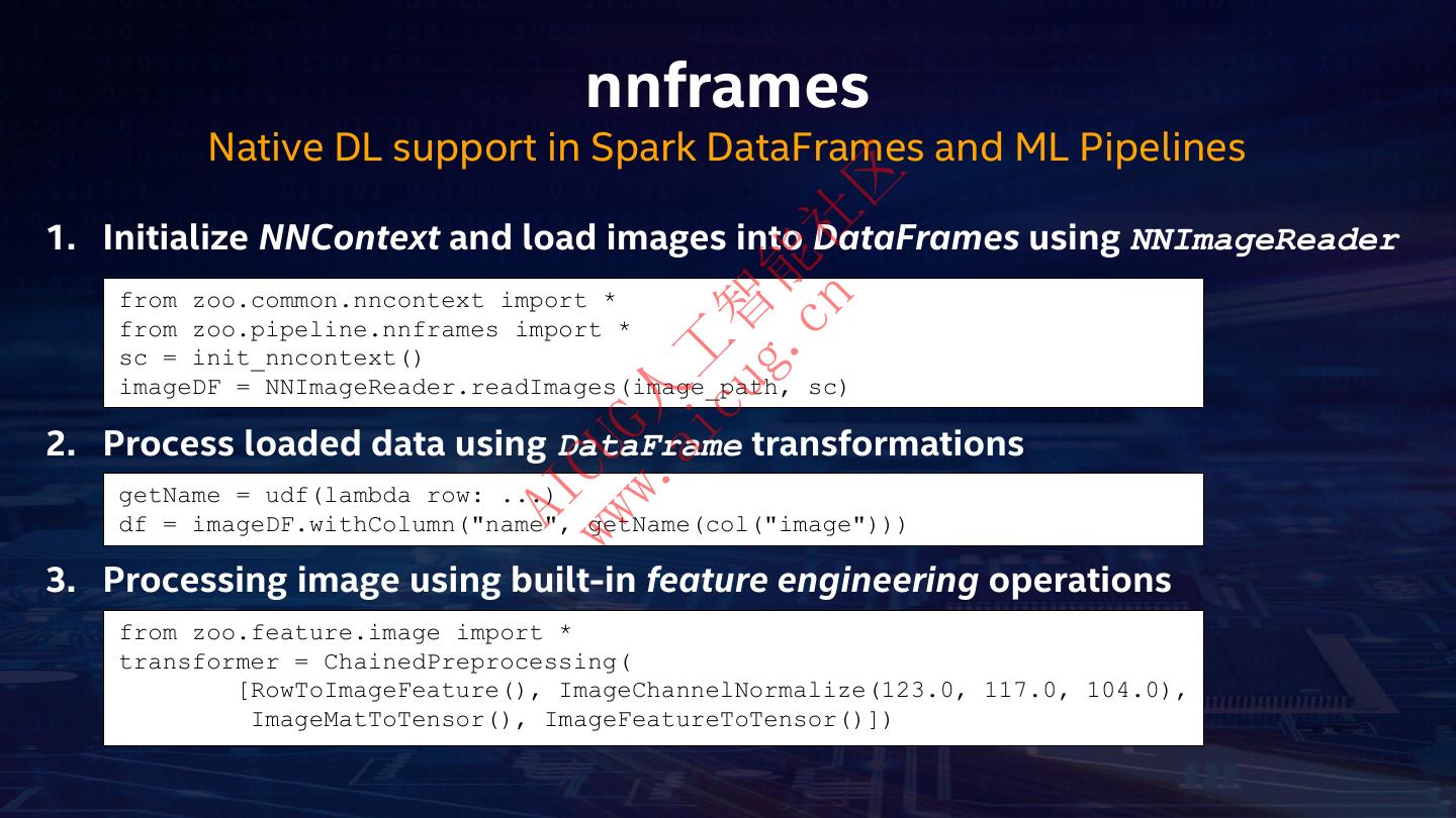 12 . nnframes Native DL support in Spark DataFrames and ML Pipelines 区 cn 社 1. Initialize NNContext and load images into DataFrames using NNImageReader g. 能 from zoo.common.nncontext import * cu 智 from zoo.pipeline.nnframes import * ai 工 sc = init_nncontext() imageDF = NNImageReader.readImages(image_path, sc) w. G人 2. Process loaded data using DataFrame transformations ww CU getName = udf(lambda row: ...) AI df = imageDF.withColumn("name", getName(col("image"))) 3. Processing image using built-in feature engineering operations from zoo.feature.image import * transformer = ChainedPreprocessing( [RowToImageFeature(), ImageChannelNormalize(123.0, 117.0, 104.0), ImageMatToTensor(), ImageFeatureToTensor()])