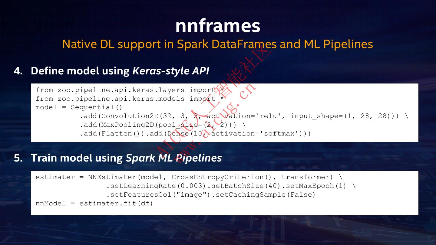 13 . nnframes Native DL support in Spark DataFrames and ML Pipelines 区 cn 社 4. Define model using Keras-style API g. 能 from zoo.pipeline.api.keras.layers import * cu 智 from zoo.pipeline.api.keras.models import * ai 工 model = Sequential() .add(Convolution2D(32, 3, 3, activation='relu', input_shape=(1, 28, 28))) \ w. G人 .add(MaxPooling2D(pool_size=(2, 2))) \ .add(Flatten()).add(Dense(10, activation='softmax'))) ww CU AI 5. Train model using Spark ML Pipelines estimater = NNEstimater(model, CrossEntropyCriterion(), transformer) \ .setLearningRate(0.003).setBatchSize(40).setMaxEpoch(1) \ .setFeaturesCol("image").setCachingSample(False) nnModel = estimater.fit(df)