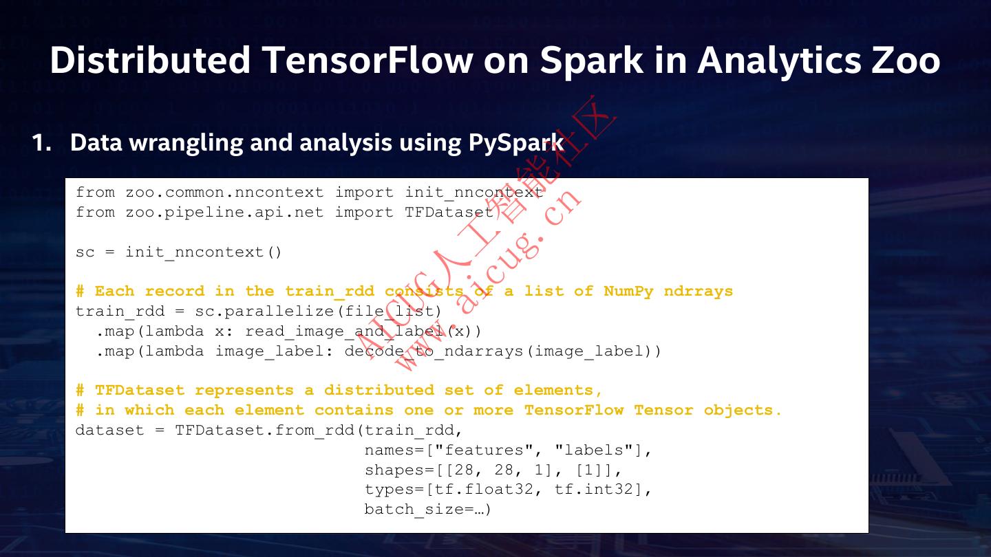 14 . Distributed TensorFlow on Spark in Analytics Zoo 区 1. Data wrangling and analysis using PySpark cn 社 g. 能 from zoo.common.nncontext import init_nncontext cu 智 from zoo.pipeline.api.net import TFDataset ai 工 sc = init_nncontext() w. G人 # Each record in the train_rdd consists of a list of NumPy ndrrays train_rdd = sc.parallelize(file_list) ww CU .map(lambda x: read_image_and_label(x)) AI .map(lambda image_label: decode_to_ndarrays(image_label)) # TFDataset represents a distributed set of elements, # in which each element contains one or more TensorFlow Tensor objects. dataset = TFDataset.from_rdd(train_rdd, names=["features", "labels"], shapes=[[28, 28, 1], [1]], types=[tf.float32, tf.int32], batch_size=…)
