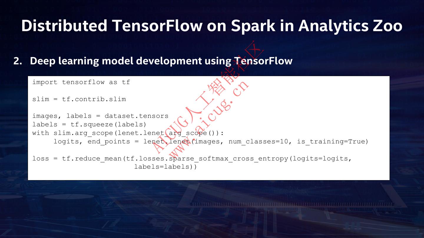 15 . Distributed TensorFlow on Spark in Analytics Zoo 区 2. Deep learning model development using TensorFlow cn 社 g. 能 import tensorflow as tf cu 智 slim = tf.contrib.slim ai 工 w. G人 images, labels = dataset.tensors labels = tf.squeeze(labels) with slim.arg_scope(lenet.lenet_arg_scope()): ww CU logits, end_points = lenet.lenet(images, num_classes=10, is_training=True) AI loss = tf.reduce_mean(tf.losses.sparse_softmax_cross_entropy(logits=logits, labels=labels))
