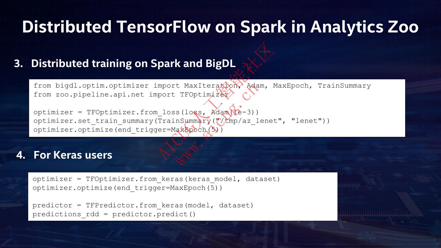 16 . Distributed TensorFlow on Spark in Analytics Zoo 区 3. Distributed training on Spark and BigDL cn 社 g. 能 from bigdl.optim.optimizer import MaxIteration, Adam, MaxEpoch, TrainSummary cu 智 from zoo.pipeline.api.net import TFOptimizer ai 工 optimizer = TFOptimizer.from_loss(loss, Adam(1e-3)) w. G人 optimizer.set_train_summary(TrainSummary("/tmp/az_lenet", "lenet")) optimizer.optimize(end_trigger=MaxEpoch(5)) ww CU 4. For Keras users AI optimizer = TFOptimizer.from_keras(keras_model, dataset) optimizer.optimize(end_trigger=MaxEpoch(5)) predictor = TFPredictor.from_keras(model, dataset) predictions_rdd = predictor.predict()