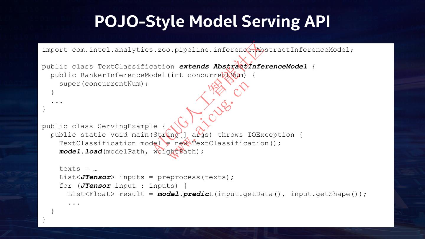 18 . POJO-Style Model Serving API import com.intel.analytics.zoo.pipeline.inference.AbstractInferenceModel; 区 cn 社 public class TextClassification extends AbstractInferenceModel { public RankerInferenceModel(int concurrentNum) { g. 能 super(concurrentNum); cu 智 } ... ai 工 } w. G人 public class ServingExample { ww CU public static void main(String[] args) throws IOException { TextClassification model = new TextClassification(); AI model.load(modelPath, weightPath); texts = … List<JTensor> inputs = preprocess(texts); for (JTensor input : inputs) { List<Float> result = model.predict(input.getData(), input.getShape()); ... } }