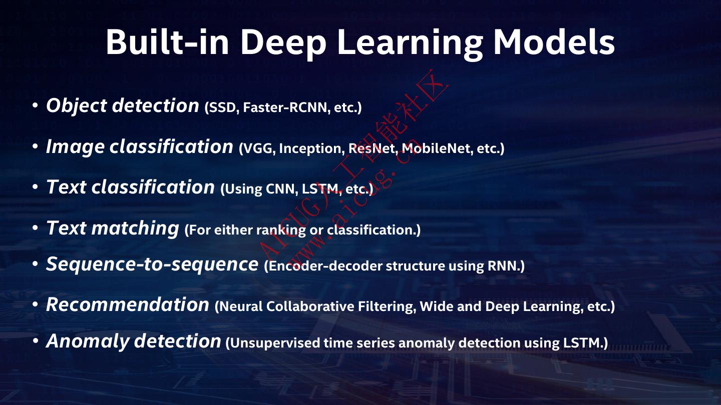 19 . Built-in Deep Learning Models 区 • Object detection (SSD, Faster-RCNN, etc.) cn 社 g. 能 • Image classification (VGG, Inception, ResNet, MobileNet, etc.) cu 智 ai 工 • Text classification (Using CNN, LSTM, etc.) w. G人 • Text matching (For either ranking or classification.) ww CU AI • Sequence-to-sequence (Encoder-decoder structure using RNN.) • Recommendation (Neural Collaborative Filtering, Wide and Deep Learning, etc.) • Anomaly detection (Unsupervised time series anomaly detection using LSTM.)