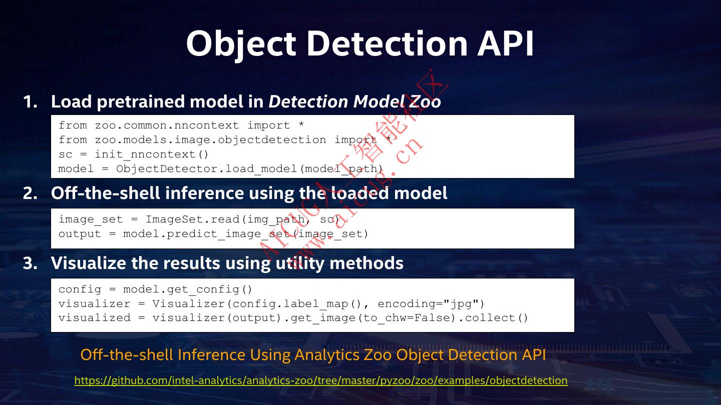 20 . Object Detection API 区 1. Load pretrained model in Detection Model Zoo cn 社 from zoo.common.nncontext import * g. 能 from zoo.models.image.objectdetection import * cu 智 sc = init_nncontext() model = ObjectDetector.load_model(model_path) ai 工 2. Off-the-shell inference using the loaded model w. G人 image_set = ImageSet.read(img_path, sc) ww CU output = model.predict_image_set(image_set) AI 3. Visualize the results using utility methods config = model.get_config() visualizer = Visualizer(config.label_map(), encoding="jpg") visualized = visualizer(output).get_image(to_chw=False).collect() Off-the-shell Inference Using Analytics Zoo Object Detection API https://github.com/intel-analytics/analytics-zoo/tree/master/pyzoo/zoo/examples/objectdetection