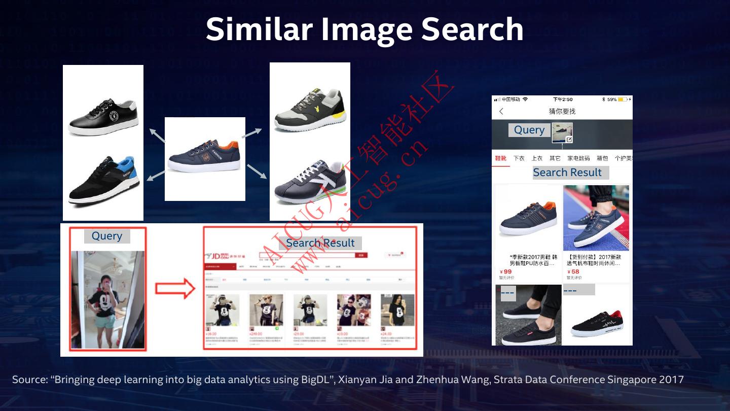 23 . Similar Image Search 区 cn 社 Query g. 能 cu 智 Search Result ai 工 w. G人 ww CU Query Search Result AI --- --- Source: “Bringing deep learning into big data analytics using BigDL”, Xianyan Jia and Zhenhua Wang, Strata Data Conference Singapore 2017