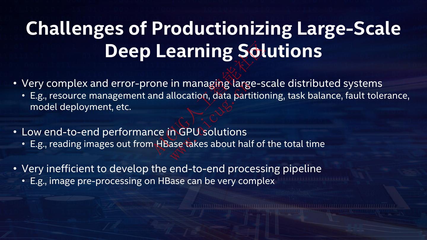 24 . Challenges of Productionizing Large-Scale Deep Learning Solutions 区 cn 社 g. 能 • Very complex and error-prone in managing large-scale distributed systems cu 智 • E.g., resource management and allocation, data partitioning, task balance, fault tolerance, ai 工 model deployment, etc. w. G人 • Low end-to-end performance in GPU solutions ww CU • E.g., reading images out from HBase takes about half of the total time AI • Very inefficient to develop the end-to-end processing pipeline • E.g., image pre-processing on HBase can be very complex