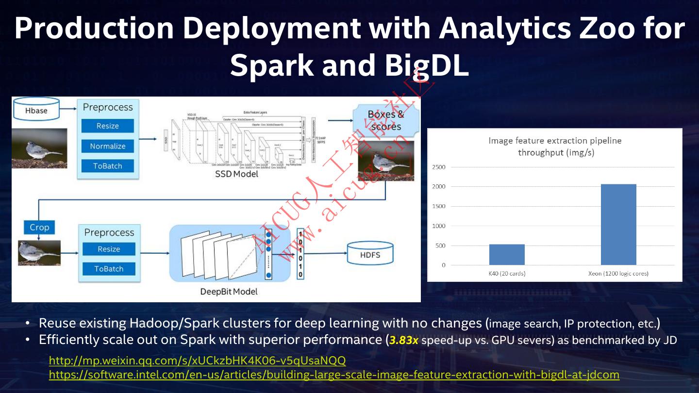 25 .Production Deployment with Analytics Zoo for Spark and BigDL 区 cn 社 g. 能 cu 智 ai 工 w. G人 ww CU AI • Reuse existing Hadoop/Spark clusters for deep learning with no changes (image search, IP protection, etc.) • Efficiently scale out on Spark with superior performance (3.83x speed-up vs. GPU severs) as benchmarked by JD http://mp.weixin.qq.com/s/xUCkzbHK4K06-v5qUsaNQQ https://software.intel.com/en-us/articles/building-large-scale-image-feature-extraction-with-bigdl-at-jdcom
