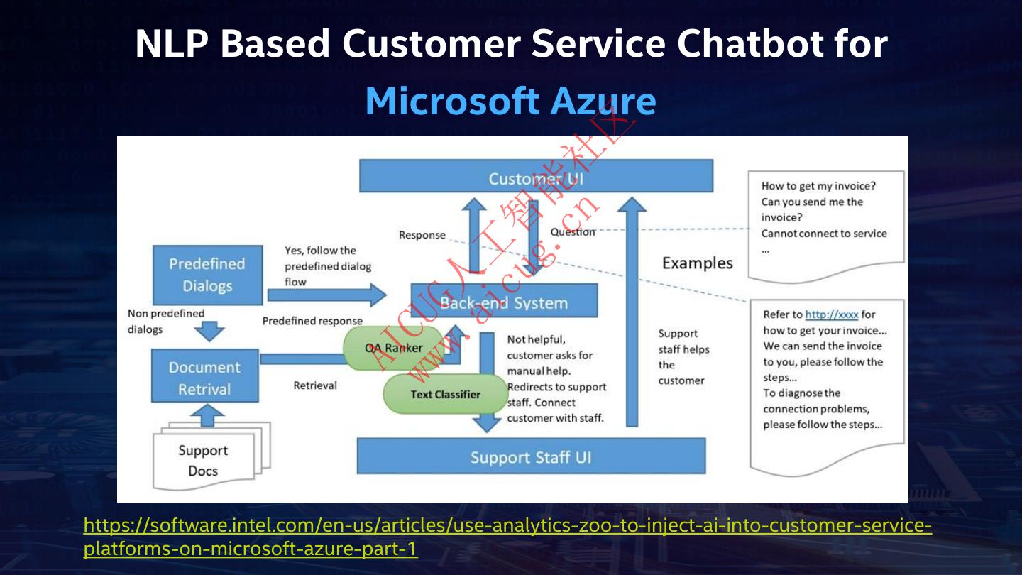 26 . NLP Based Customer Service Chatbot for Microsoft Azure 区 cn 社 g. 能 cu 智 ai 工 w. G人 ww CU AI https://software.intel.com/en-us/articles/use-analytics-zoo-to-inject-ai-into-customer-service- platforms-on-microsoft-azure-part-1